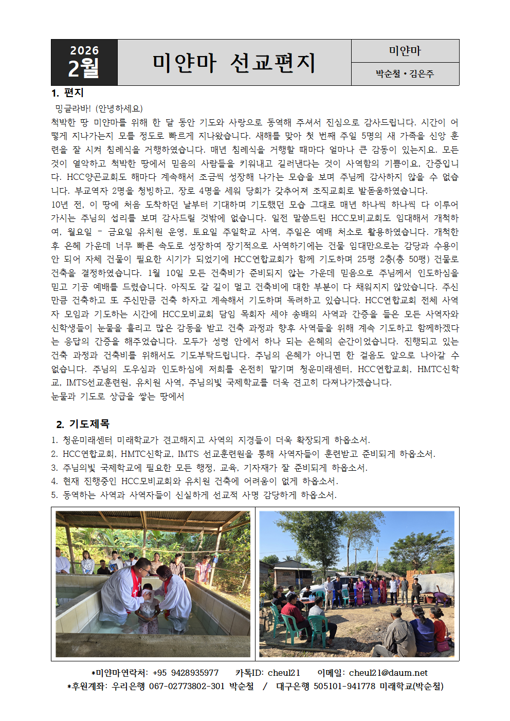| 98 | 미얀마 박순철 선교사님 3월 선교편지 | 안동서부교회 | 2026-02-28 | 42 | |